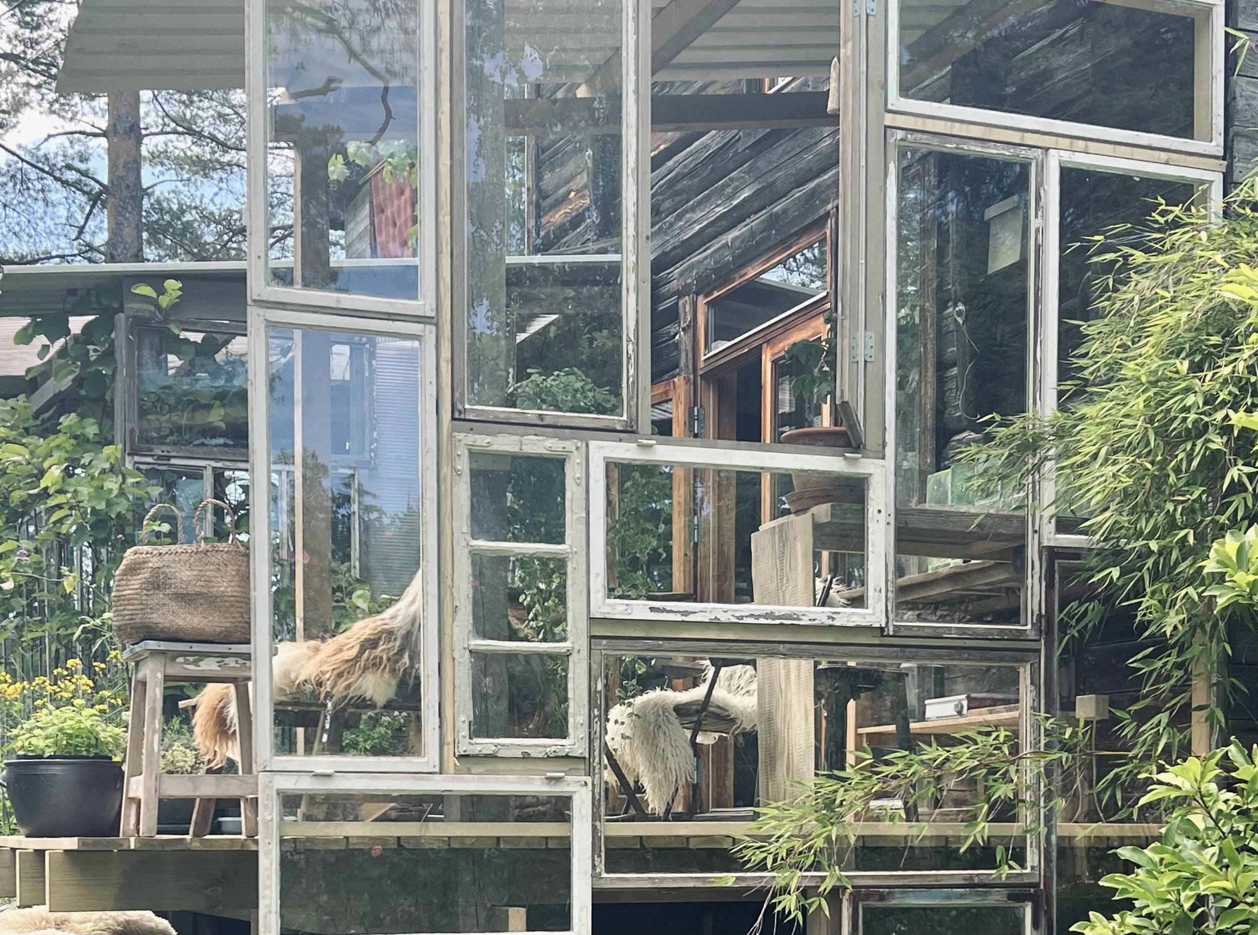 We have been building with recycled materials we have been collecting over the years, and what we don’t have we source as used materials through the internet. The old windows and metal roof plating have been cleaned up and are as good as new and make the space a little protected from rain and east-winds, and of course that is making it much more pleasurable and workable in all kinds of weather. We even have made an extra wall of windows that we put up for the winter, and as protection from too much snow blowing in.